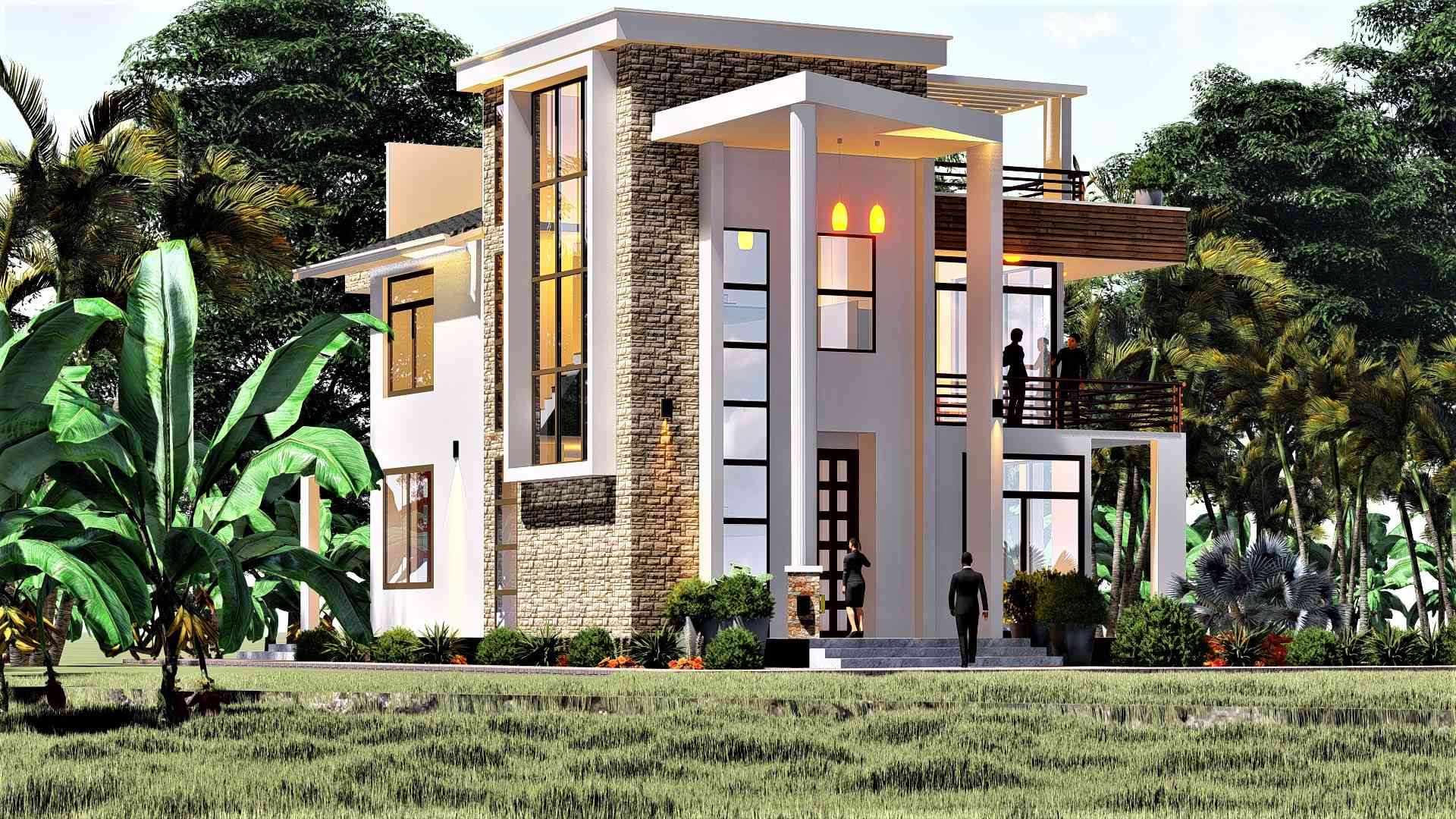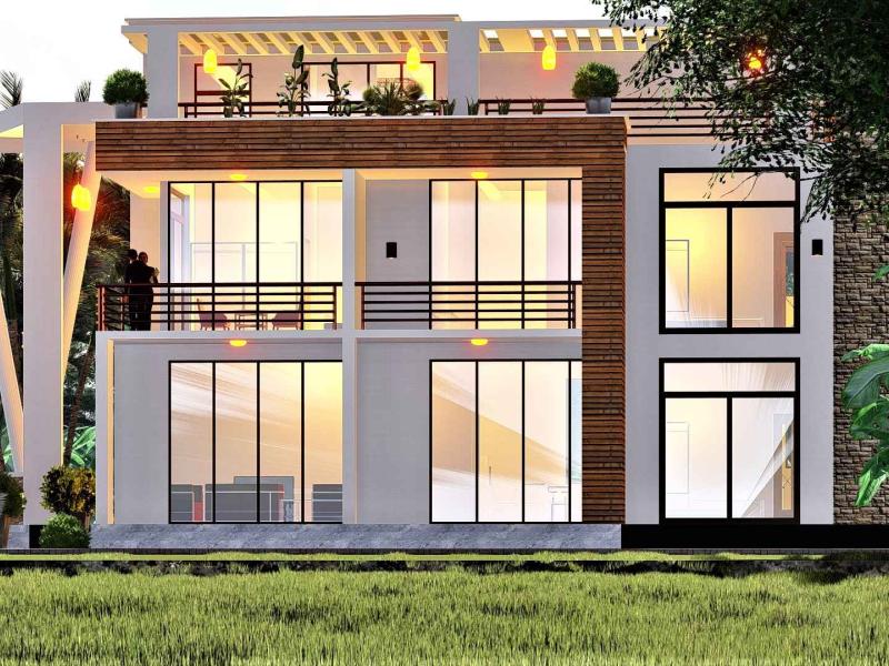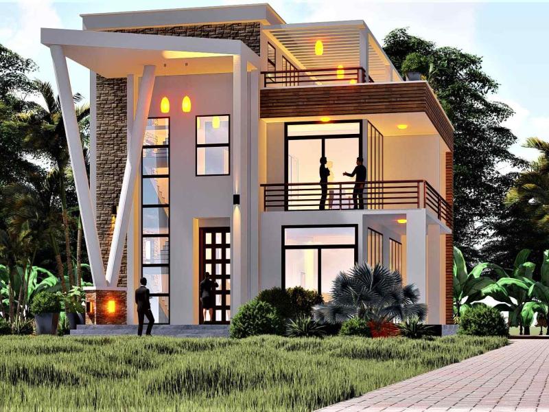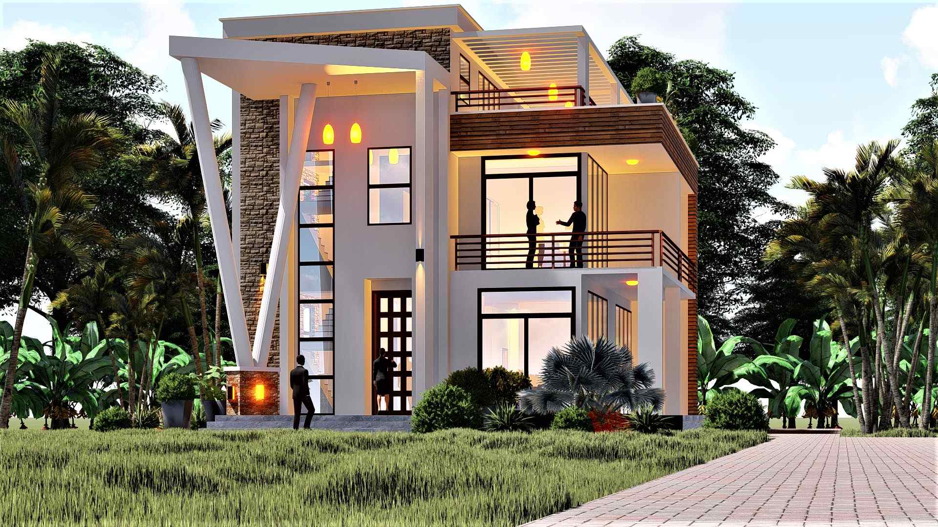 Unique three story house with well built-in rooms and balconies and pergola for chilling at the top. The double height entrance is very inviting and artistic.
