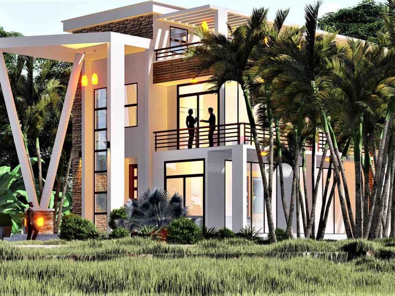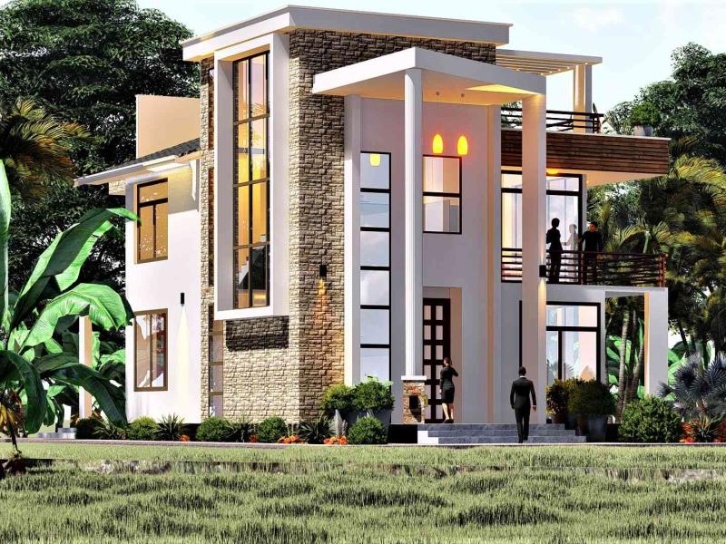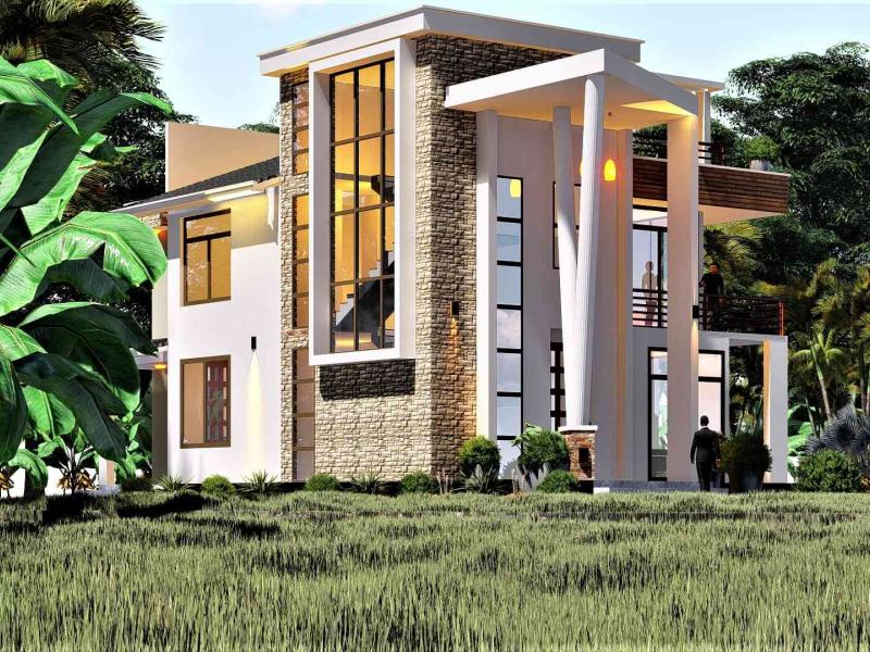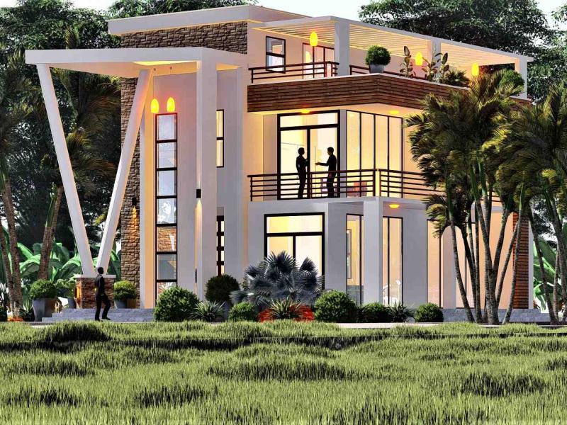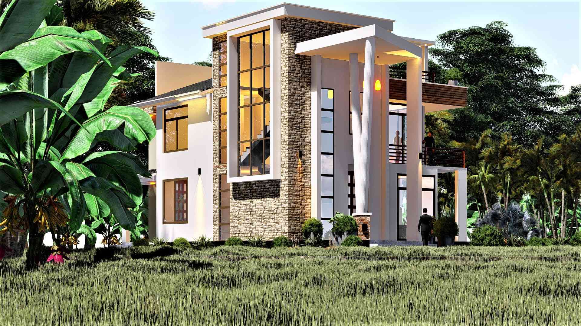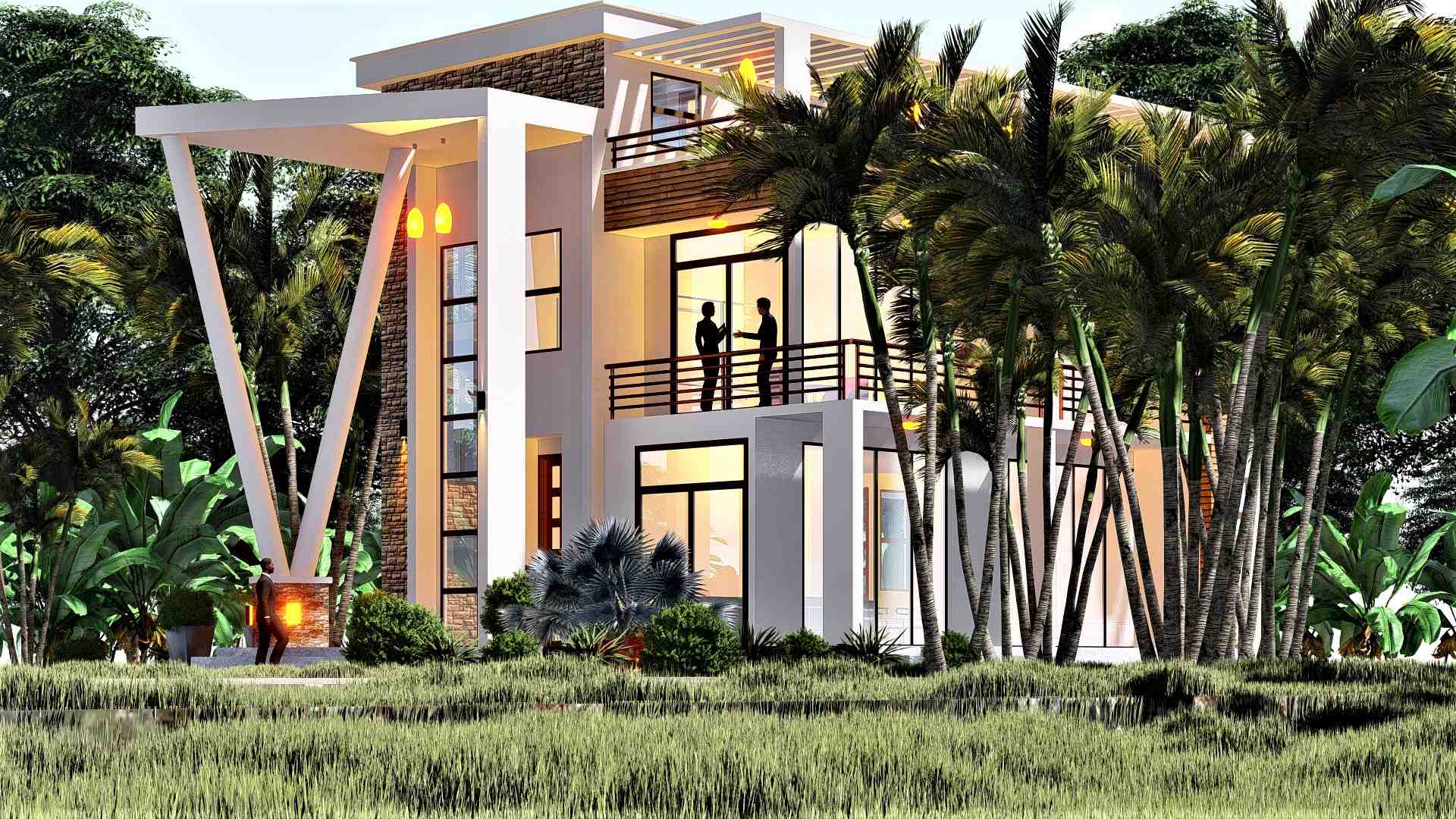 Unique three story house with well built-in rooms and balconies and pergola for chilling at the top. The double height entrance is very inviting and artistic.