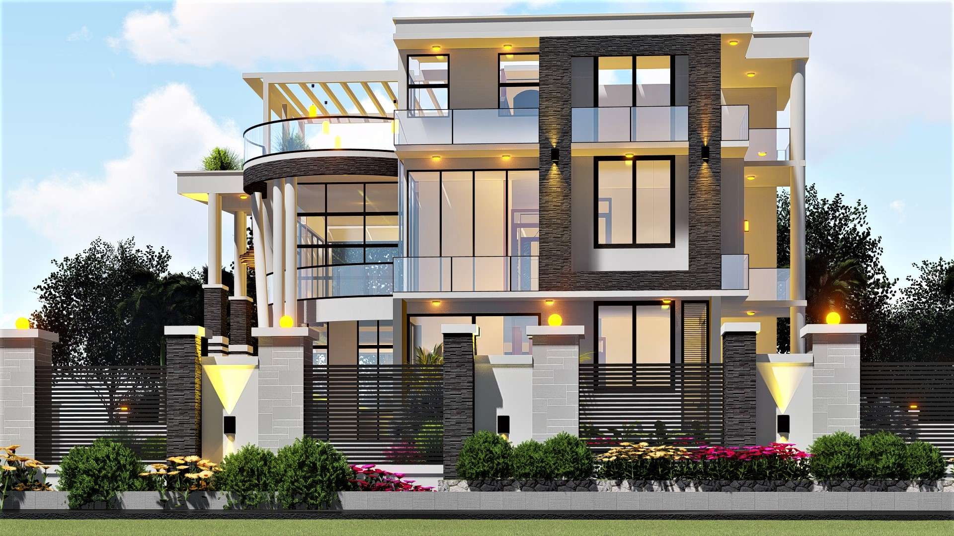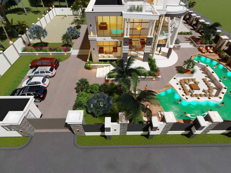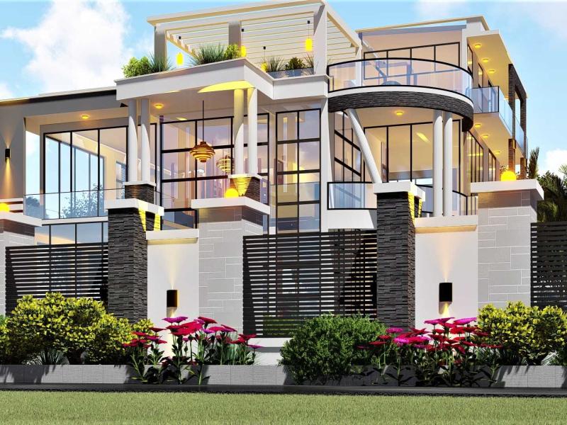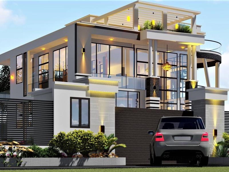 A Modern contemporary house design where glass take dominance externally which makes the whole design stand out. The uniqueness on this design is the giantism of columns to the entry and the slanting column.